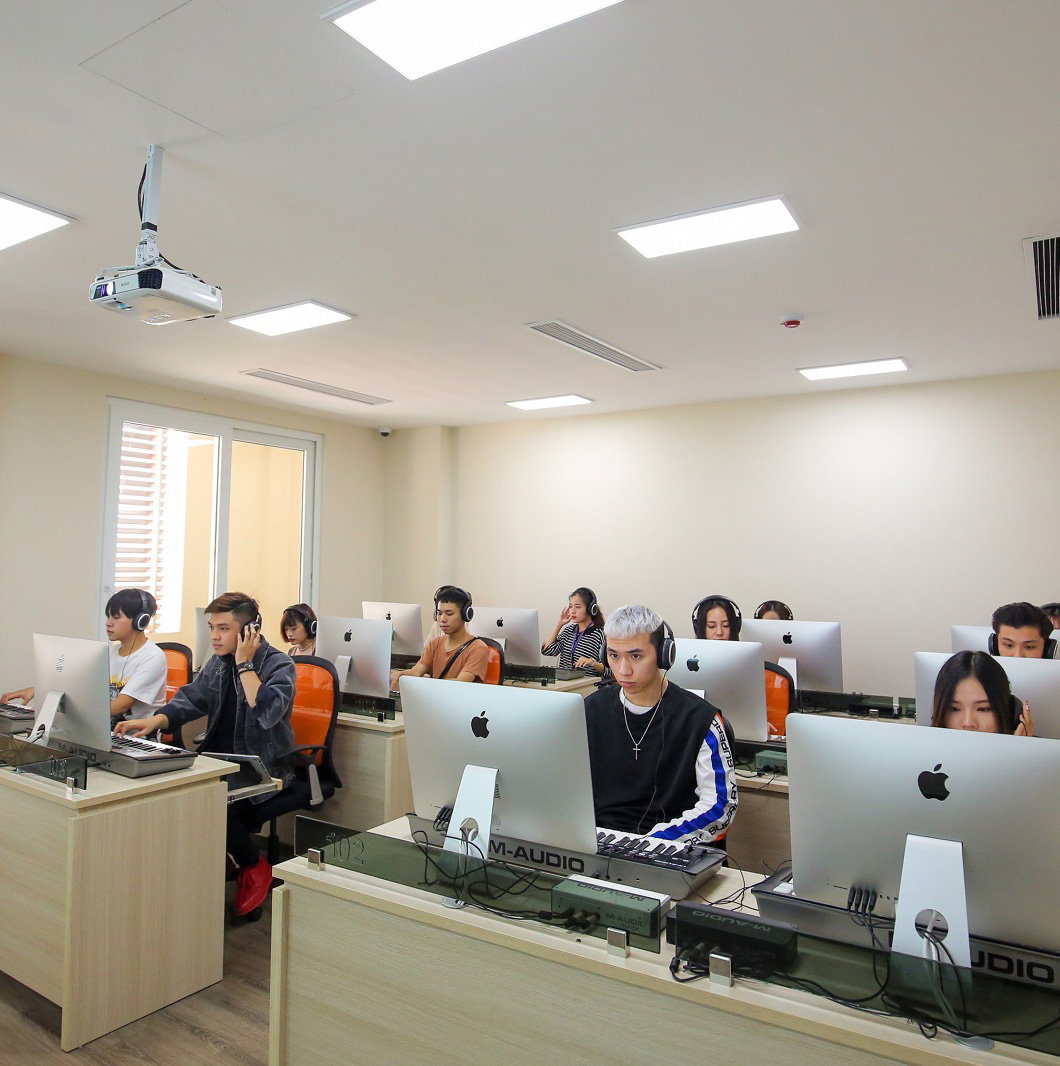 Hệ thống máy tính iMac hiện đại được chúng tôi triển khai cho Khoa Âm nhạc ứng dụng, tất cả đều cài đặt phần mềm chuyên dụng phục vụ cho việc học và sản xuất âm nhạc như: Ableton Live, Cubase, Logic Pro X,... Đây là những phần mềm cập nhật thực tế công việc, được giới sản xuất âm nhạc chuyên nghiệp sử dụng rộng rãi trên thế giới.