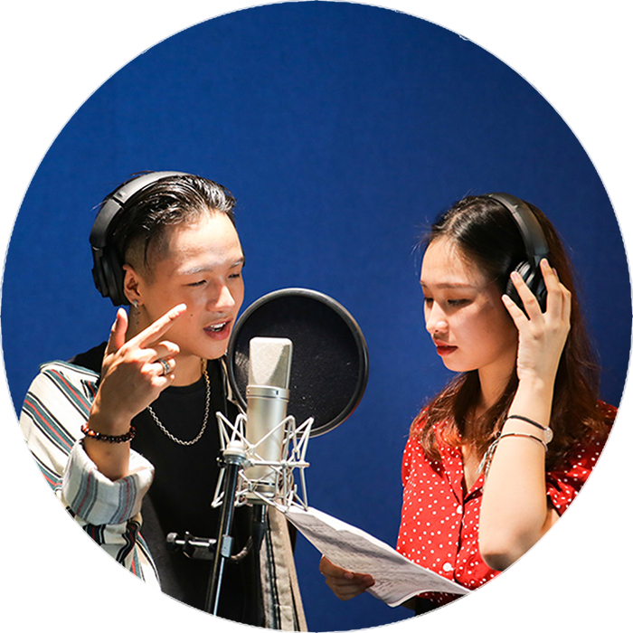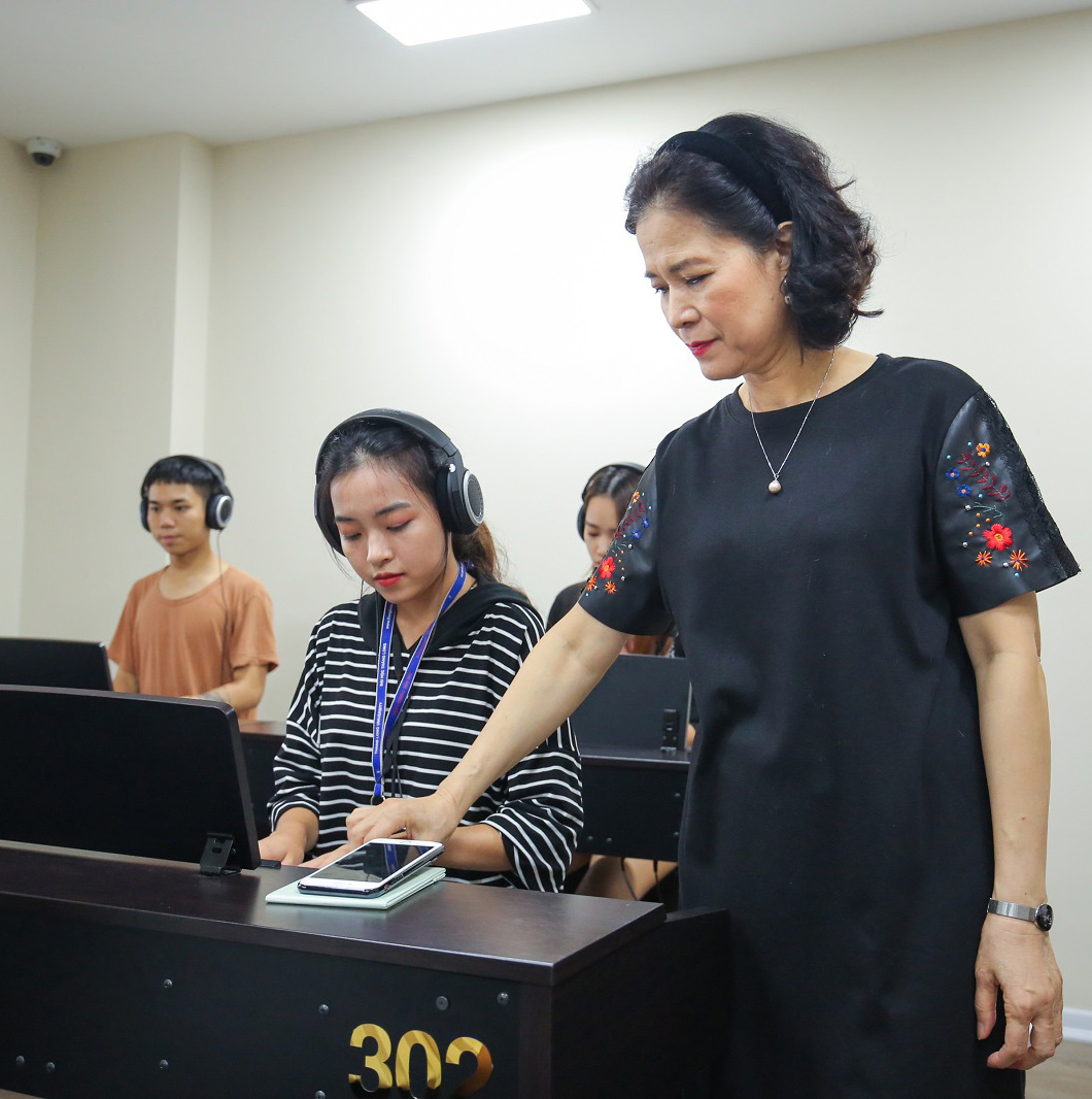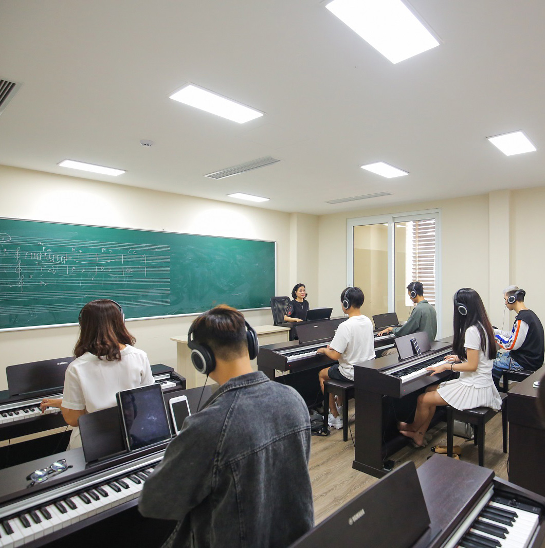 Chúng tôi thiết kế riêng cho khoa Âm nhạc ứng dụng một tổ hợp học tập - thực hành với đầy đủ các phòng học luyện thanh, phòng học sản xuất âm nhạc, phòng thu âm, sân khấu biểu diễn, phòng học piano, phòng học nhạc cụ khác (trống, guitar…).