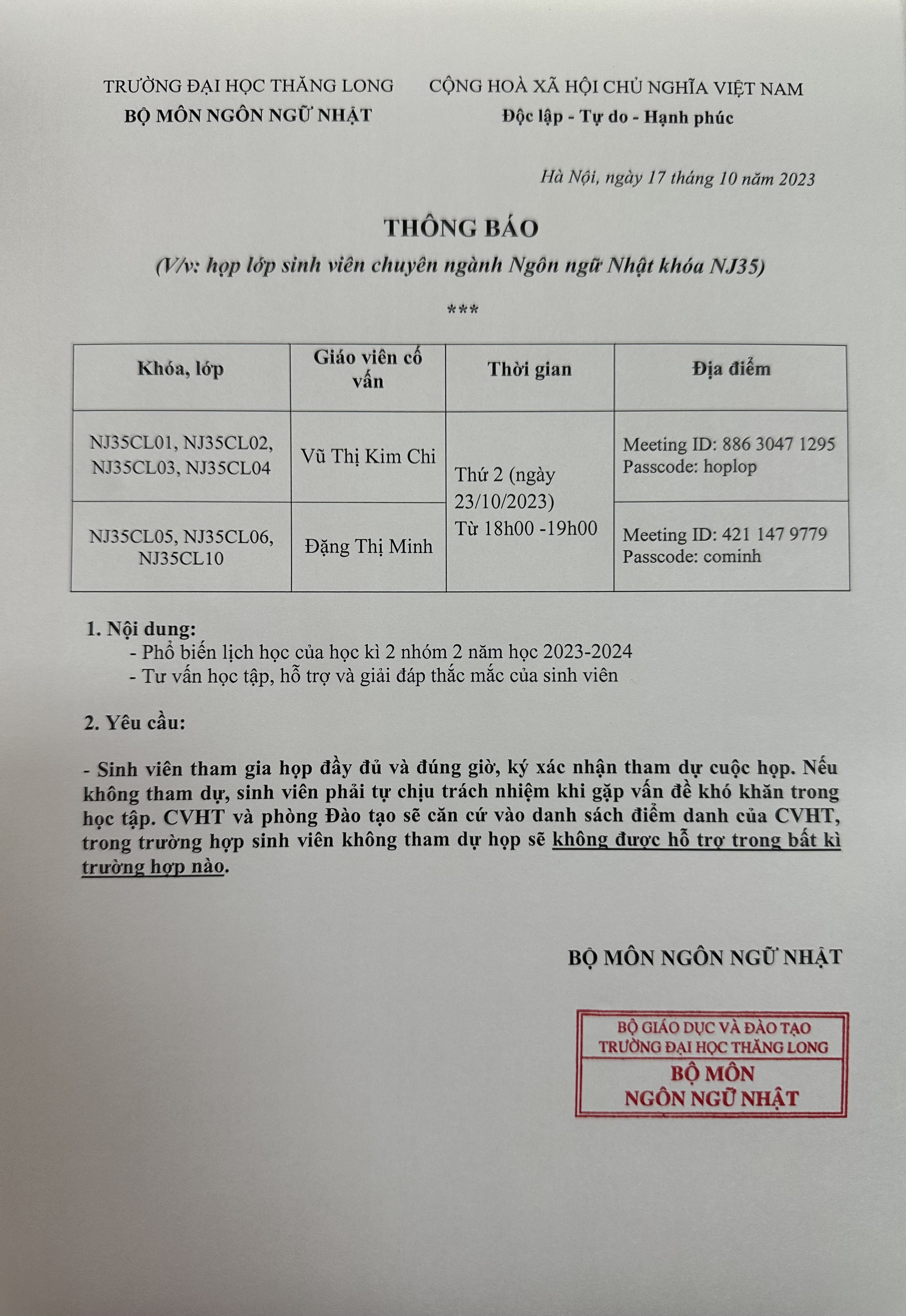 LỊCH HỌP CỐ VẤN HỌC TẬP NJ35 HKII NHÓM 2