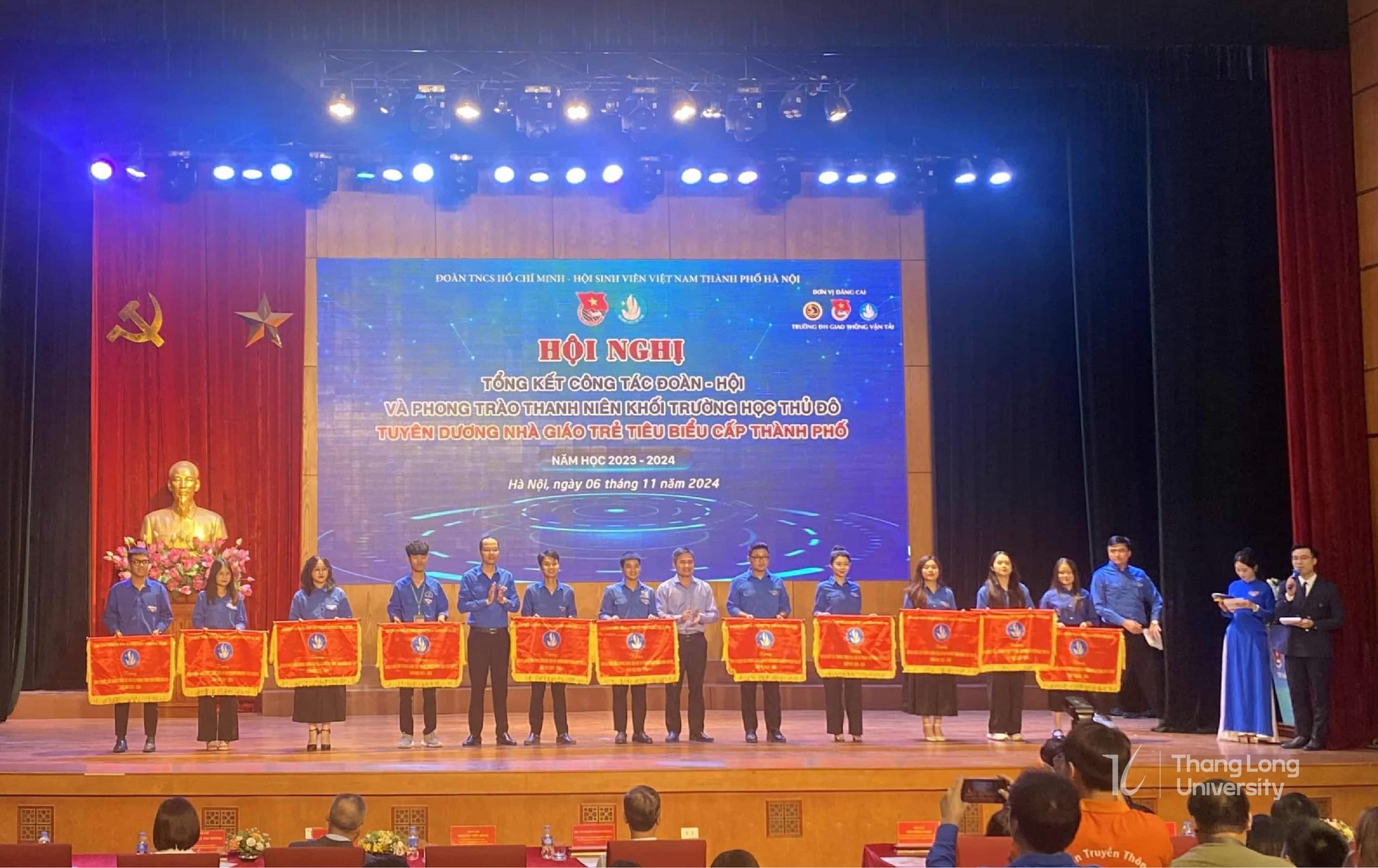 Ngày 06/11/2024 vừa qua, Đoàn Thanh niên - Hội Sinh viên Việt Nam Trường Đại học Thăng Long đã tham dự Hội nghị tổng kết công tác Đoàn - Hội và phong trào thanh niên, sinh viên khối trường học Thủ đô năm học 2023 - 2024; Tuyên dương “Nhà giáo trẻ tiêu biểu cấp thành phố năm 2024".
