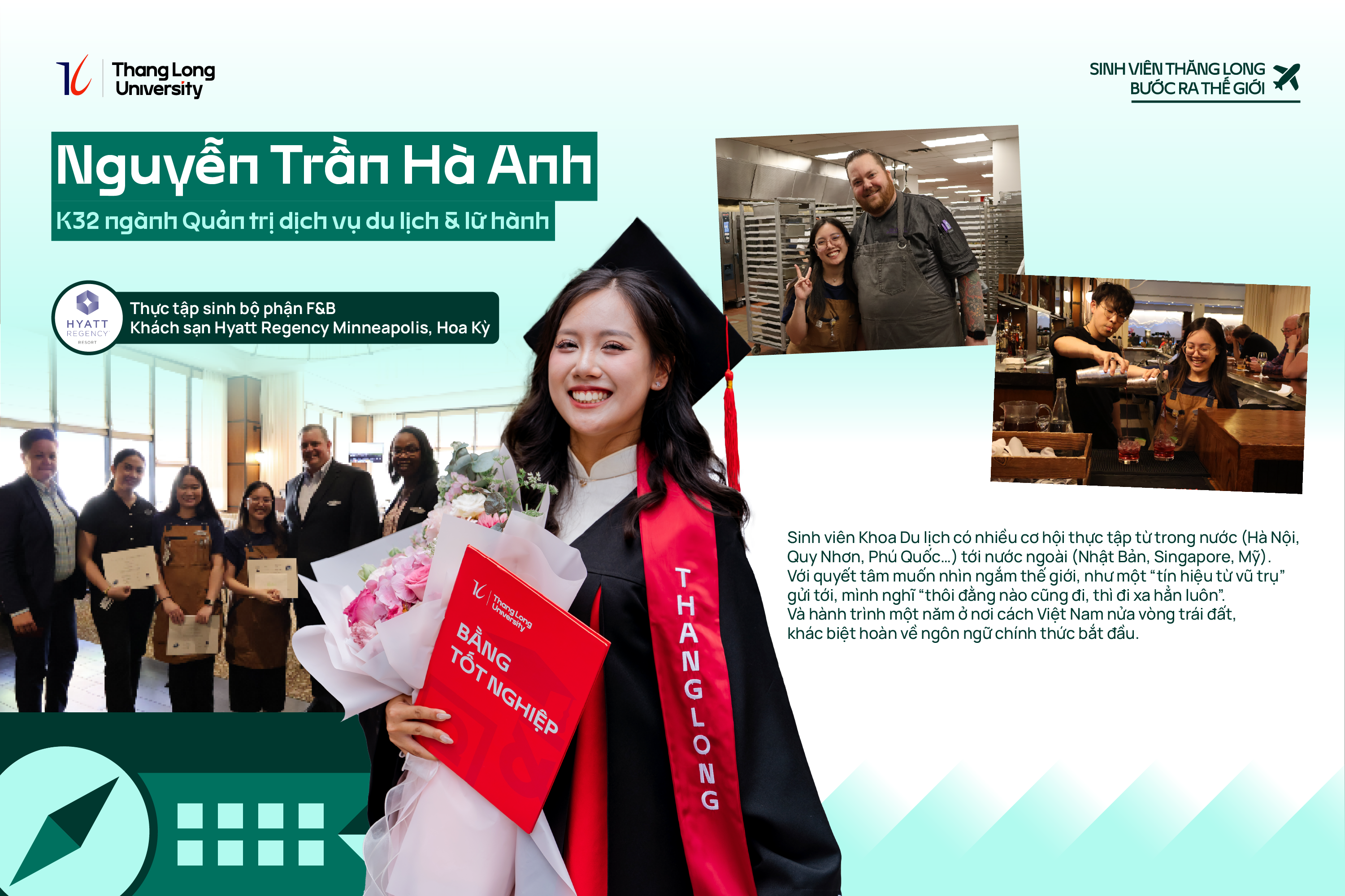 Tiếp nối series “Sinh viên Thăng Long bước ra thế giới”, Thang Long Portrait có dịp gặp gỡ bạn Nguyễn Trần Hà Anh, Cử nhân K32 ngành Quản trị dịch vụ du lịch và lữ hành, Trường Đại học Thăng Long - cô gái đã can đảm hiện thực hóa ước mơ “tự lập ở một đất nước khác” qua chuyến thực tập 01 năm tại Khách sạn Hyatt Regency Minneapolis, Hoa Kỳ.
