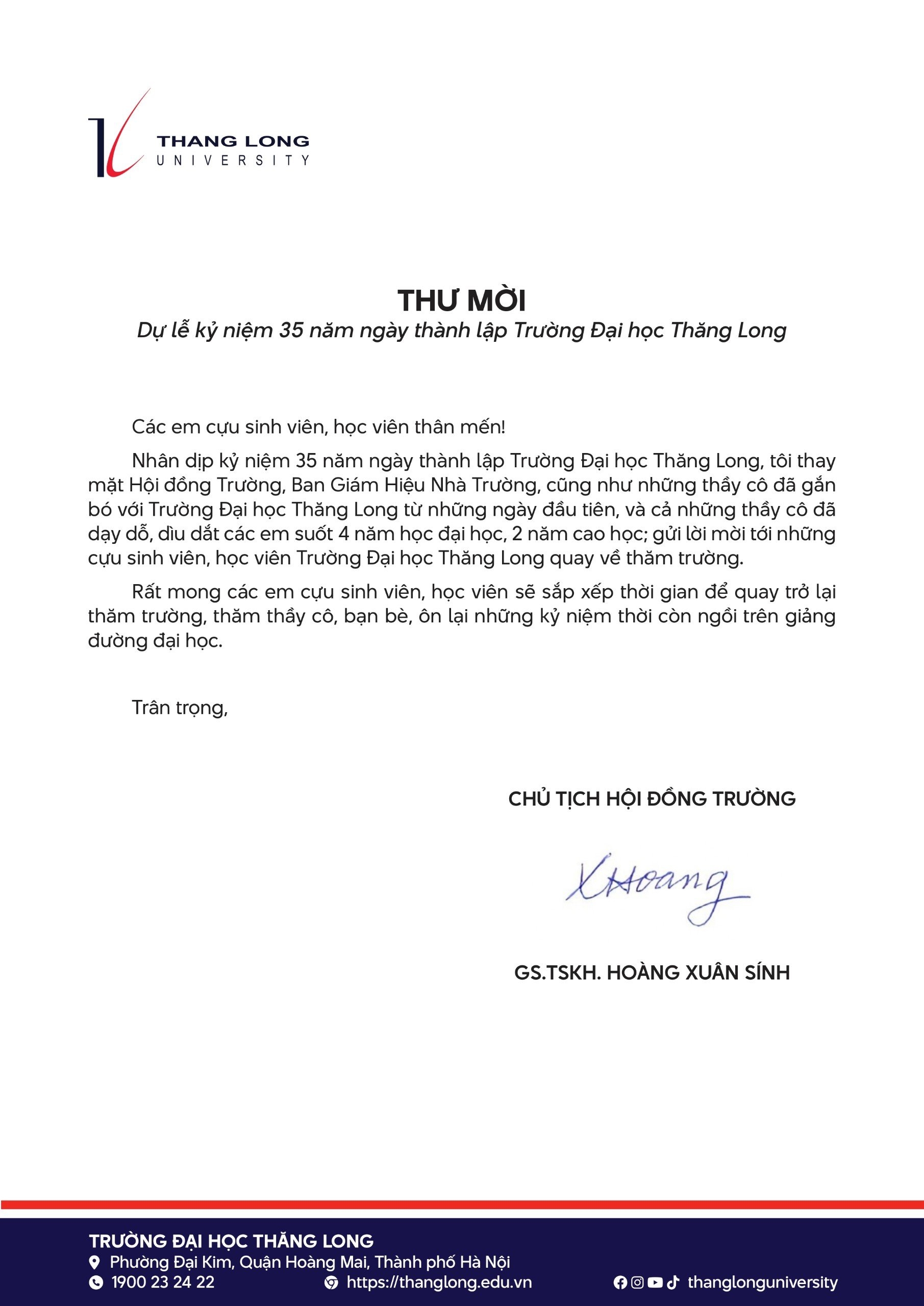 Thư mời cựu sinh viên/cựu học viên/tiến sĩ tham dự Lễ kỷ niệm 35 năm thành lập Trường Đại học Thăng Long