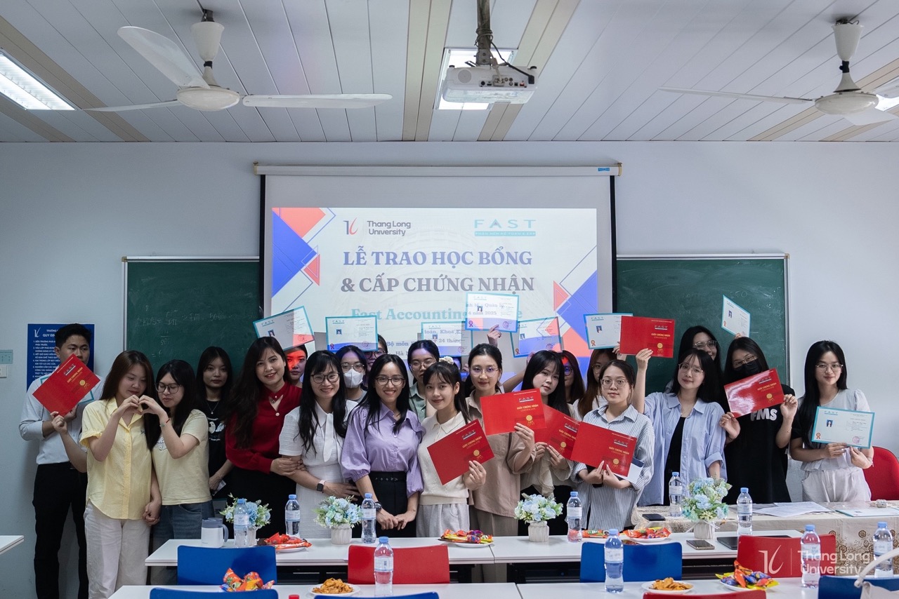 Chiều ngày 25/4/2025, tại Trường Đại học Thăng Long, Bộ môn Kế toán đã phối hợp cùng Công ty FAST tổ chức thành công Lễ trao học bổng và chứng nhận Fast Accounting Online cho 36 sinh viên ngành Kế toán.