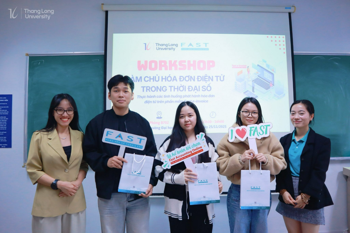 Nhằm giúp sinh viên ngành Kế toán tiếp cận sớm với các nghiệp vụ thực tế này, chiều ngày 25.11 và 27.11.2025, Bộ môn Kế toán và Trung tâm TTC - Trường Đại học Thăng Long đã phối hợp với Công ty Cổ phần Phần mềm Quản lý Doanh nghiệp FAST tổ chức buổi tọa đàm với chủ đề: “Làm chủ hóa đơn điện tử trong thời đại số”.