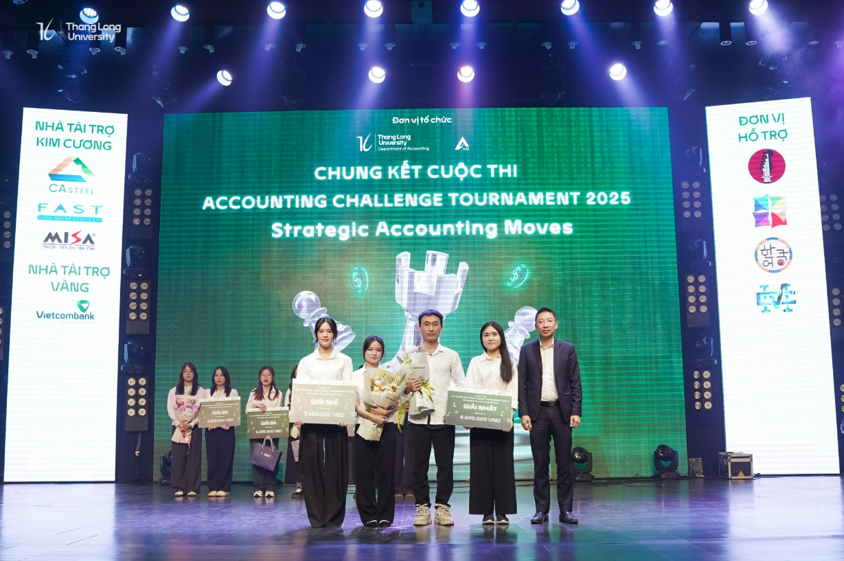 Vòng chung kết cuộc thi “Accounting Challenge Tournament 2025” đã chính thức khép lại, đặt dấu mốc kết thúc cho một hành trình tri thức – bản lĩnh – sáng tạo đầy cảm hứng của các thí sinh. Đây là cuộc thi học thuật đầu tiên được tổ chức bởi Bộ môn Kế toán, Trường Đại học Thăng Long với quy mô sinh viên trên địa bàn thành phố Hà Nội nhằm tạo sân chơi cho các bạn trẻ yêu thích tài chính, kế toán và kiểm toán.