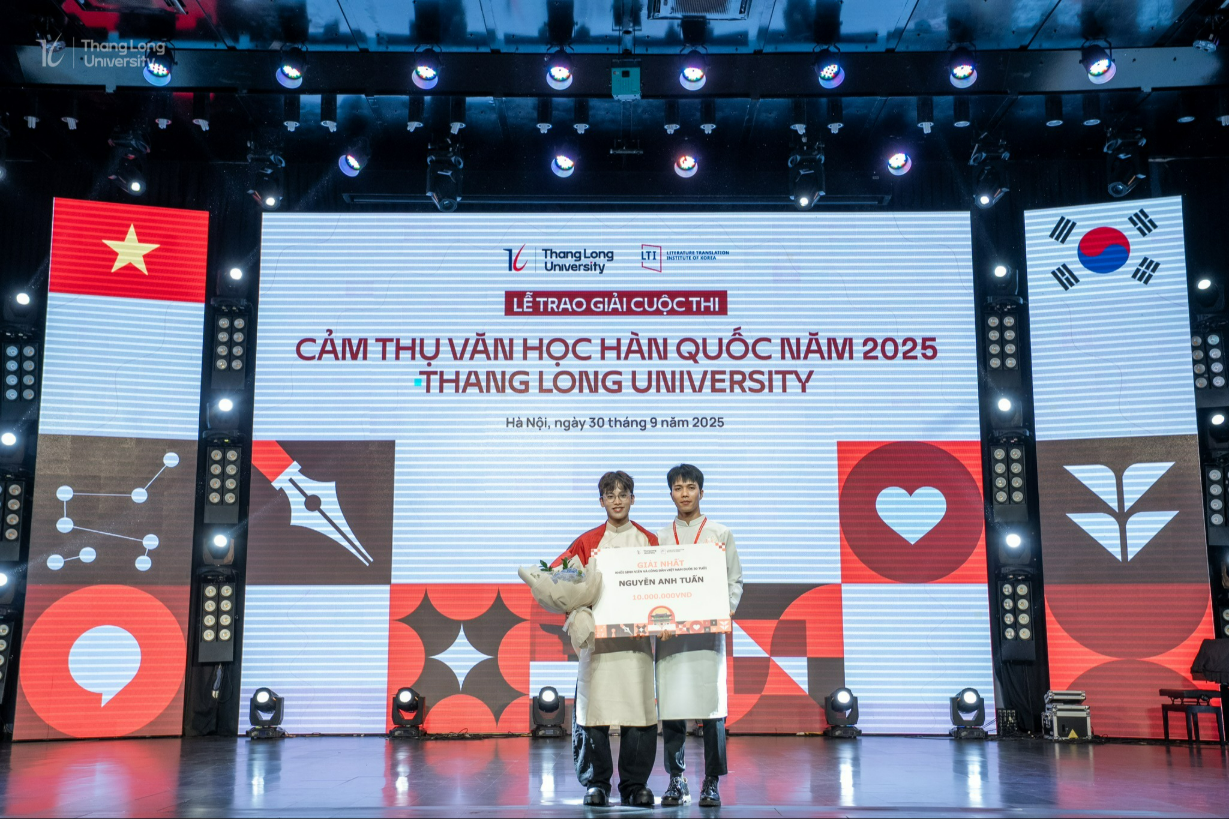 Ngày 30.09.2025 vừa qua, tại Hội trường Tạ Quang Bửu, Trường Đại học Thăng Long, Bộ môn Ngôn ngữ Hàn Quốc phối hợp cùng Viện Dịch thuật Văn học Hàn Quốc (LTI Korea) đã tổ chức Lễ trao giải Cuộc thi Cảm thụ Văn học Hàn Quốc 2025. Buổi lễ có sự tham dự của đại diện Ban Lãnh đạo Nhà trường, Trưởng Bộ môn Ngôn ngữ Hàn Quốc, đại diện Trung tâm Văn hóa Hàn Quốc tại Việt Nam cùng đông đảo sinh viên.